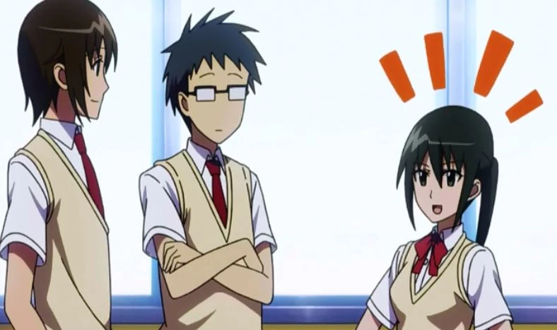 Mutsumi chatting with her classmates Takatoshi and Kenji